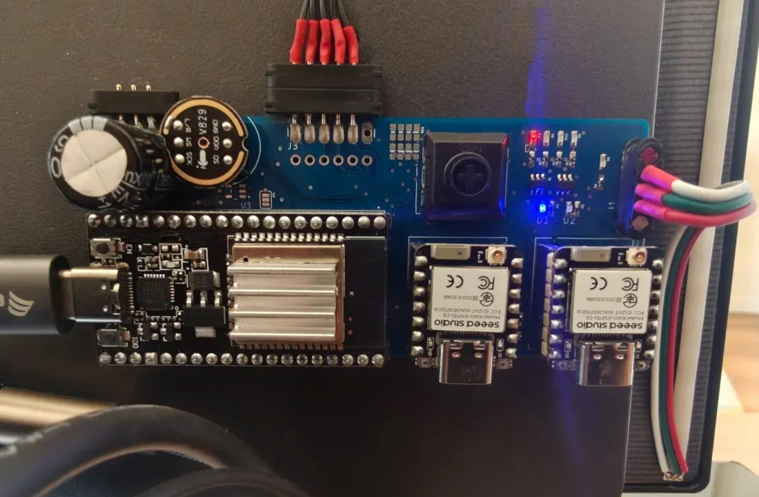 The ESP32 running the SynLight code is concidered a slave in this system and simply execute the SynLight code while holding a signal pin to 1 for the master controler. Same story for the WLED controler, minus the signal pin. The master waits for either a button press or a distance sensor detection to cycle through the modes. A rising edge of the UDP signal pin also has the master changing the mode to 0: