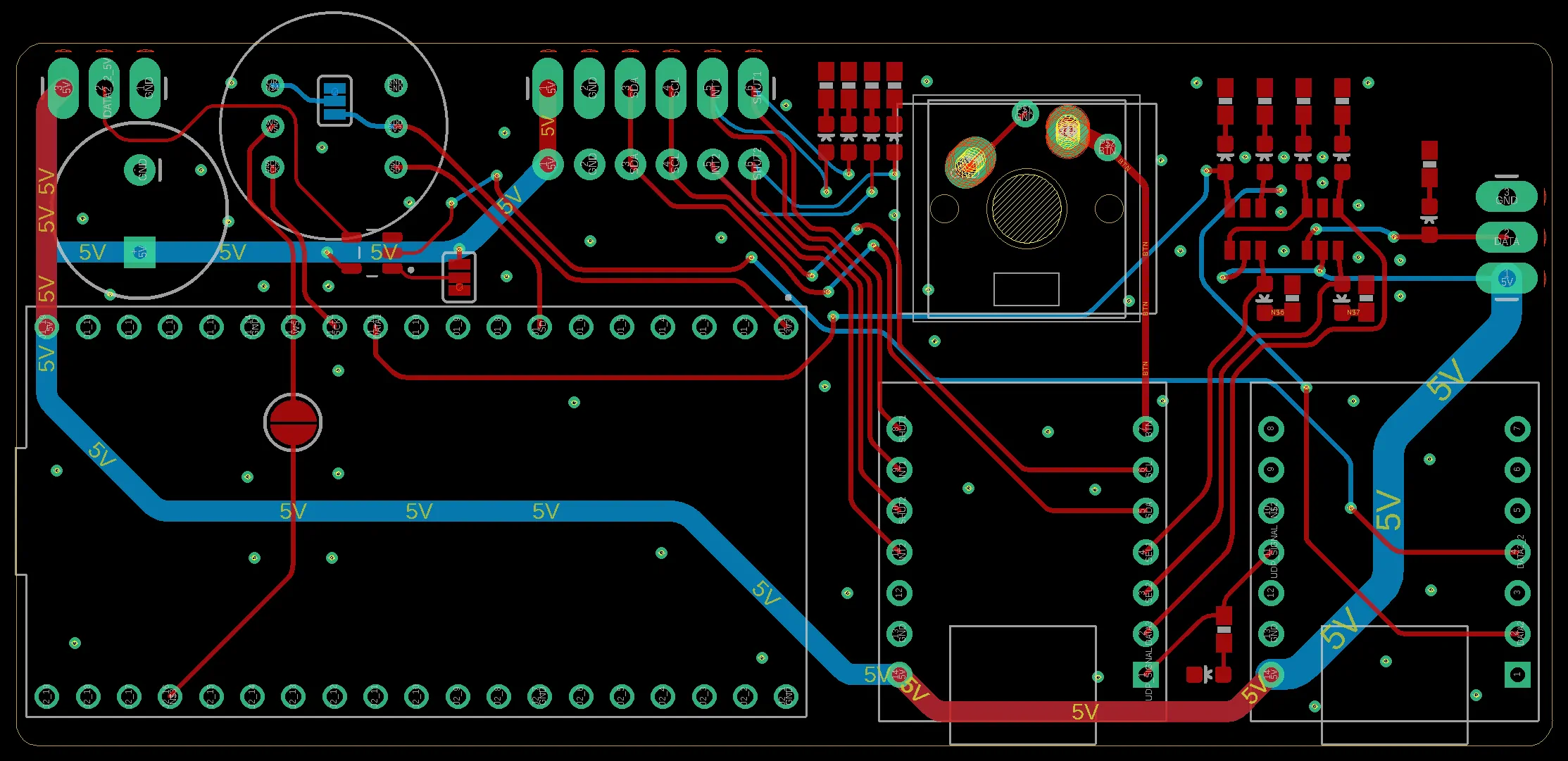 I wasn't about to dive into the WLED's source code to add my (as of yet) vaguelly defined fonctionalities. I instead use some TS5A3159 analog switches to select which one of three ESP32 controllers should drive the leds. One ESP32 controller runs SynLight, one runs WLED, and another one is the conductor.