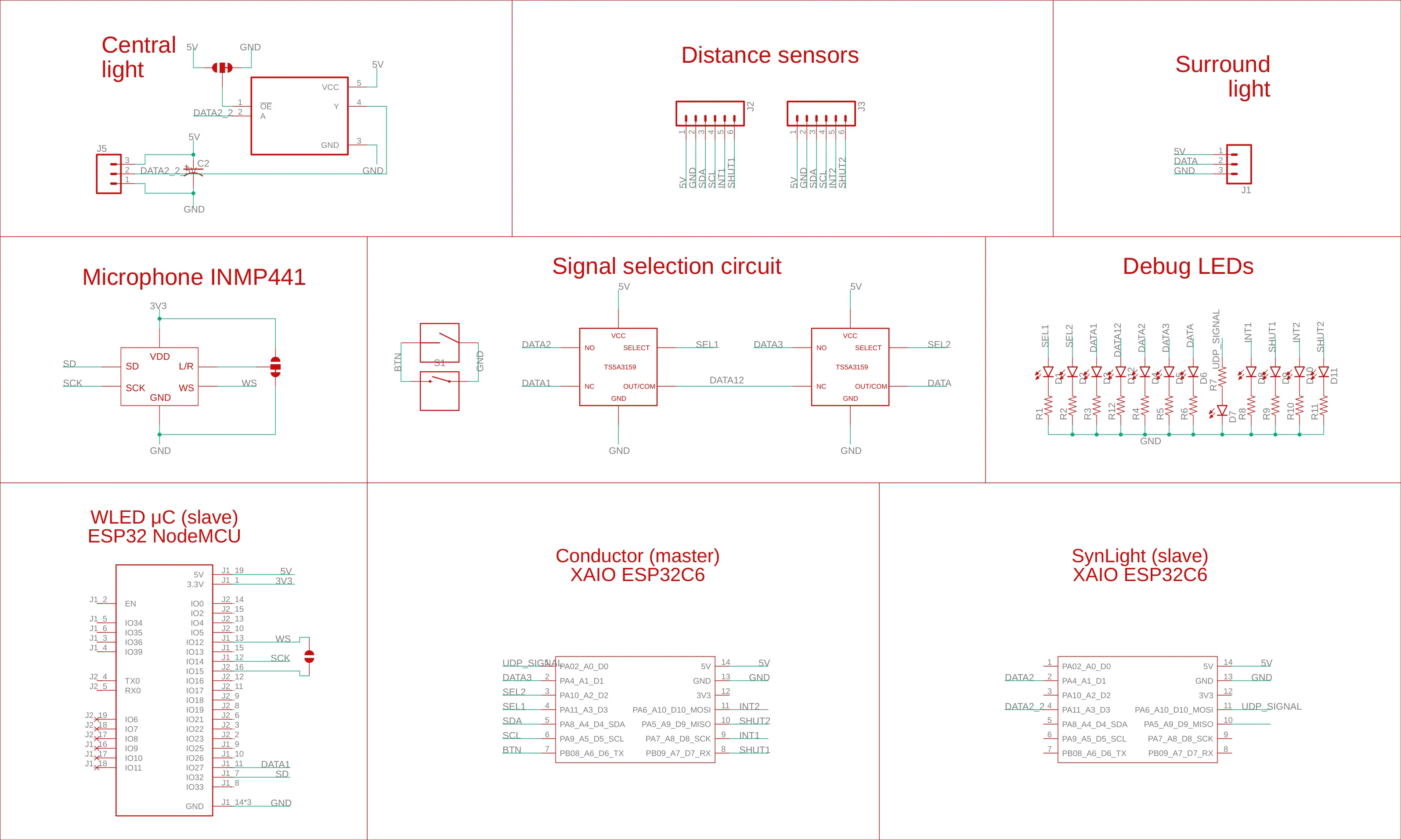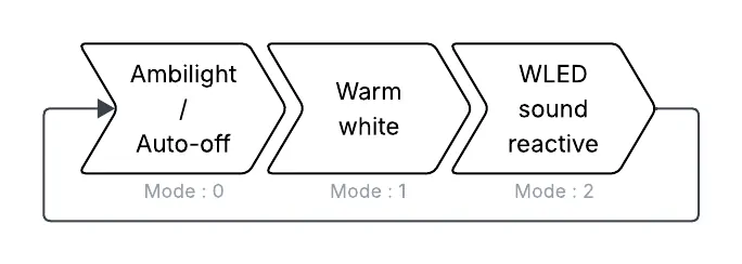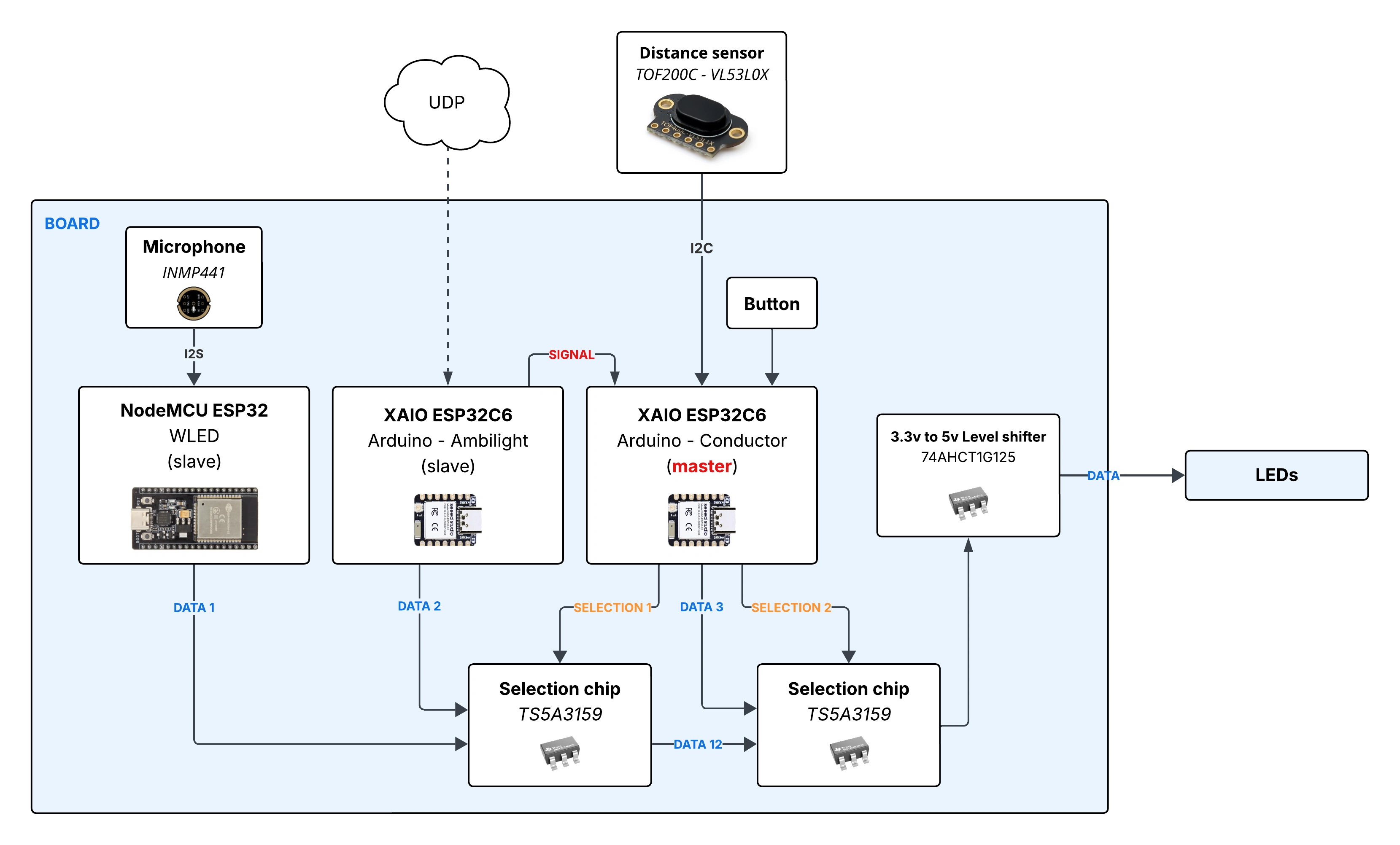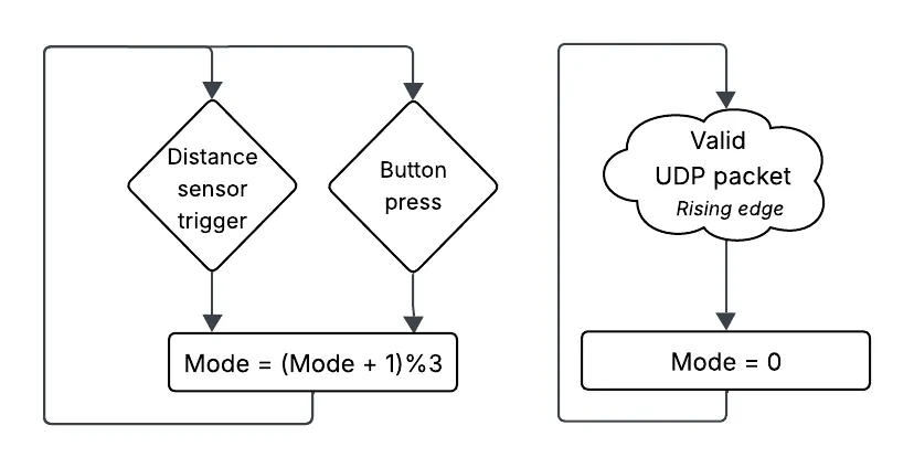 The ESP32 running the SynLight code is concidered a slave in this system and simply execute the SynLight code while holding a signal pin to 1 for the master controler. Same story for the WLED controler, minus the signal pin. The master waits for either a button press or a distance sensor detection to cycle through the modes. A rising edge of the UDP signal pin also has the master changing the mode to 0: