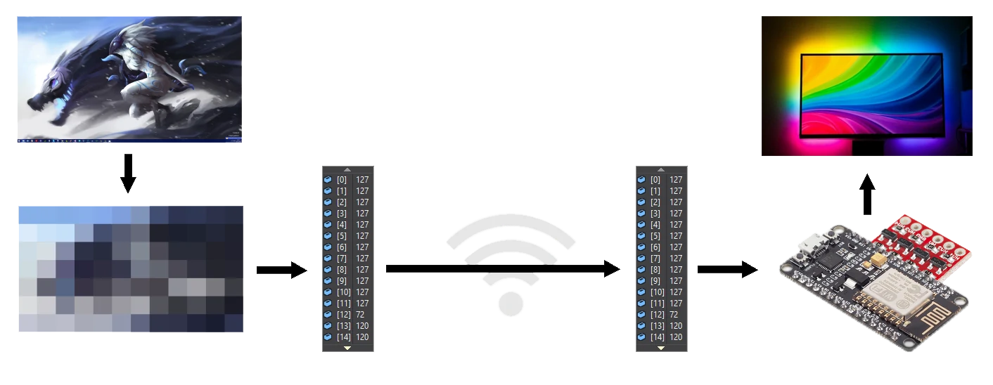 The idea behind this project was to create my own Ambilight system. Such system uses LEDs on the rear of the screen to replicate the color of its edges. This creates a pleasant experience while watching movies but is also enjoyable on a daily use, as it reduces visual fatigue. I love this feature but unfortunately it is only available with Philips TVs. I spent some time playing around with individually addressable RGB LEDs (WS2812B, also known as Neopixel from Adafruit) and I program softwares to run on Windows regularly so why not try to combine these two ?